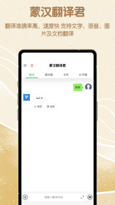 1.蒙汉翻译君是一款极具实用性的翻译软件,能够满足用户在日常生活、学习和工作中的翻译需求。无论是想要学习蒙古语的汉语用户,还是需要进行汉语交流的蒙古语用户,这款应用都能提供极大的帮助。